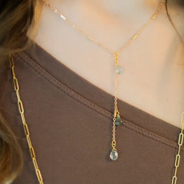 3 Moss Aquamarine tear drop stones are wire wrapped onto our delicate link bar chain. This chain is gold plated brass chain. The length is 16” with a 2” extender at the back and the Y Tassel hangs 2” in length. Moss aquamarine ranges from light blue to mossy green. These stones have beautiful inclusions and a very beachy earthy feel to them. Aquamarine’s meaning is based on the sea. It encompasses exhilaration & calm, while inspiring trust, truth, reflection, & letting go. Necklaces all ship with Santore Jewelry hang tags with gemstone information on the back of each card.