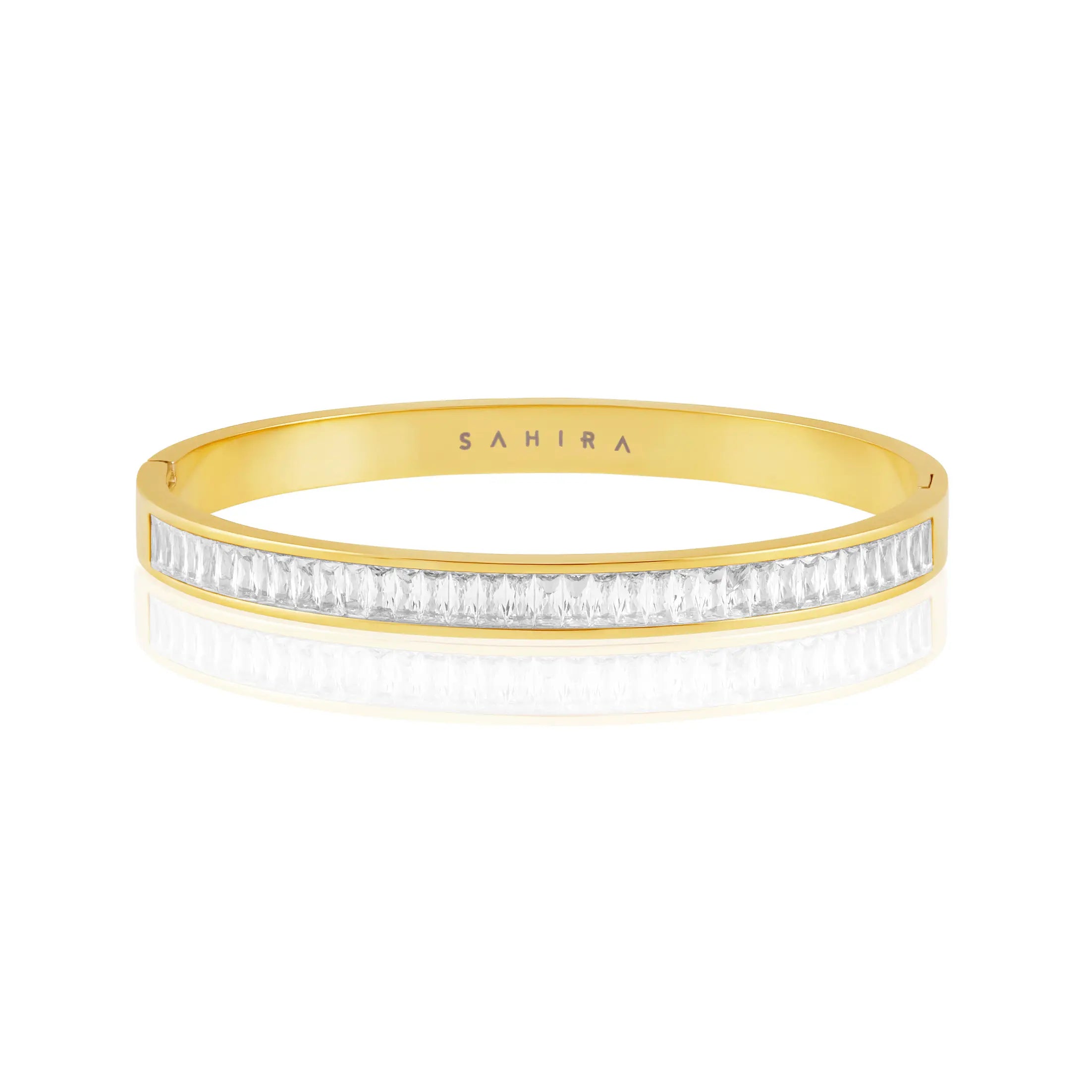 There's no such thing as too much bling, especially when it comes to our nicola cz bracelet. A fabulous statement piece to amplify any outfit. 7" circumference 2" diameter Cz stones 18k plated over stainless steel Water & tarnish resistant