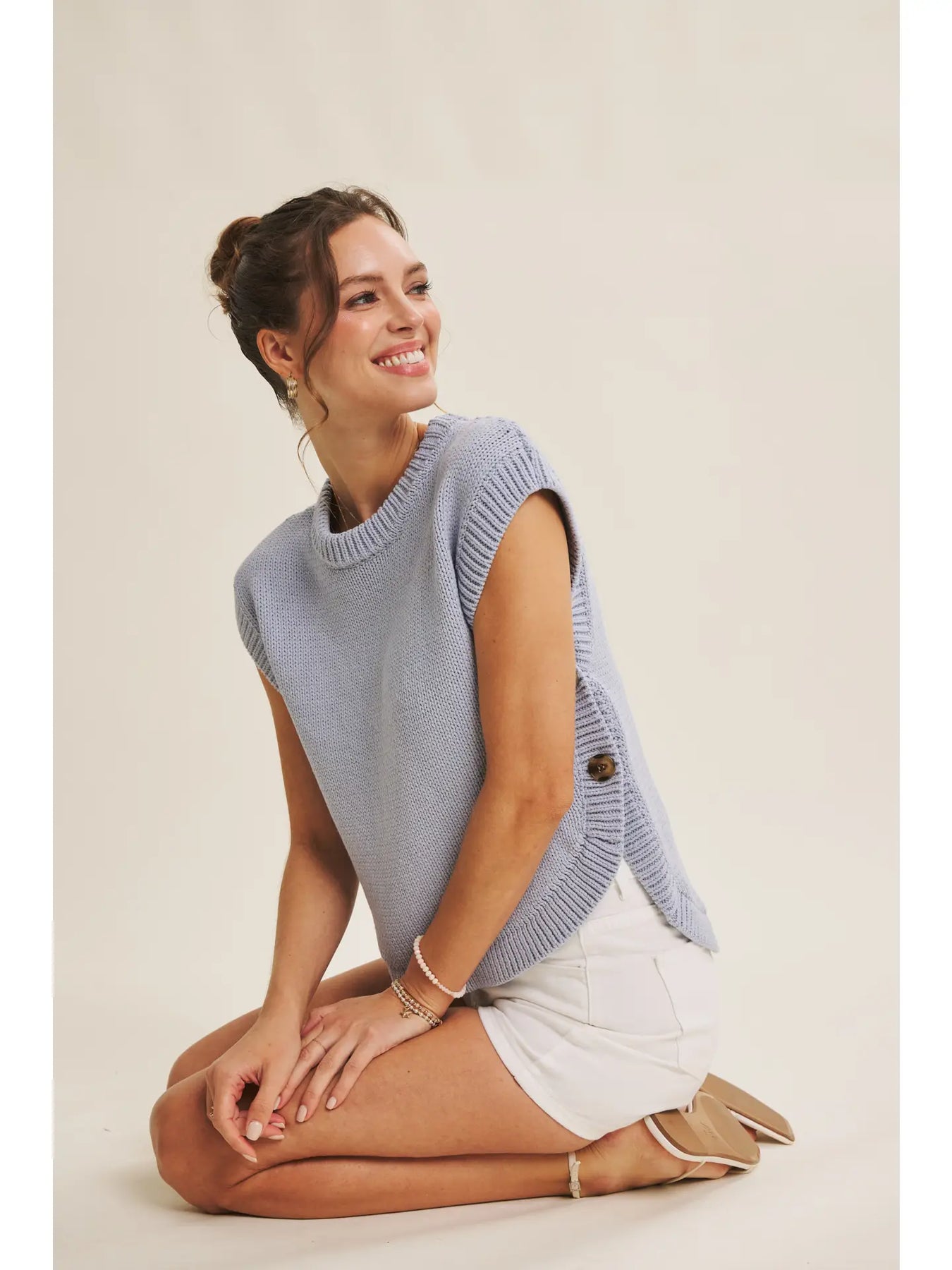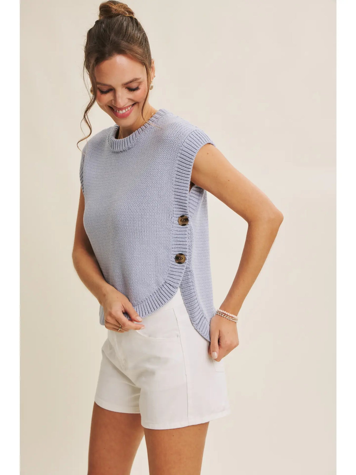 Meet your new all-year round essential. Our best-selling sweater vest top, designed for effortless layering and effortless outfits. Featuring a classic round neckline, hi-lo hem, and statement side button detailing, it blends structure with ease. The ribbed trim along the neck, sleeves, and hem adds a refined finish, while the sleeveless cut makes it perfect for transitioning between seasons. Style it solo with striped wide-leg pants for a chic resort vibe, or layer over blouses and dresses when cooler days arrive. From market mornings to office layering, this vest works hard year-round, bringing cozy-chic energy to every outfit. A timeless bestseller your customers will reach for again and again.