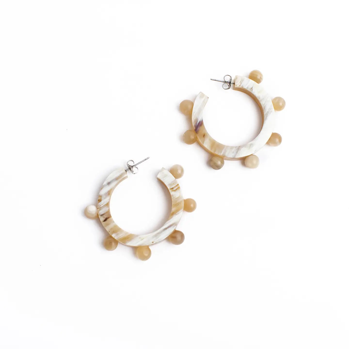 Another spin on our classic buffalo horn hoop earrings, we wanted to incorporate more detail which is why we added small horn beads on top of the hoop. Still an easy earring to wear with any outfit! Dimensions: 1.7/8" x 1/4" x 1.7/8" Lightweight buffalo horn Stainless Steel ear post Your earrings are made from all-natural material and as such the horn color may vary slightly from what is shown. While all horn is very similar in appearance, no two are exactly the same. This guarantees the uniqueness of each piece and ensures your amazing jewelry is truly one of a kind! The horn for this piece is sourced via traditional cultural methods from Vietnamese Water Buffalo. The animals are not harmed in any way to obtain their horn.