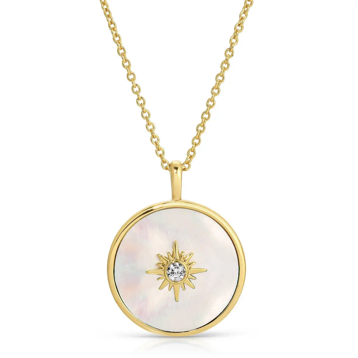 Let the north star guide you when you wear this beautiful pendant. Featuring a golden stars laid over a gemstone with a dazzling cz center. * 14k gold plated brass, cz * Genuine Mother of Pearl * pendant is 22mm * 16 inches + 2 inch extender