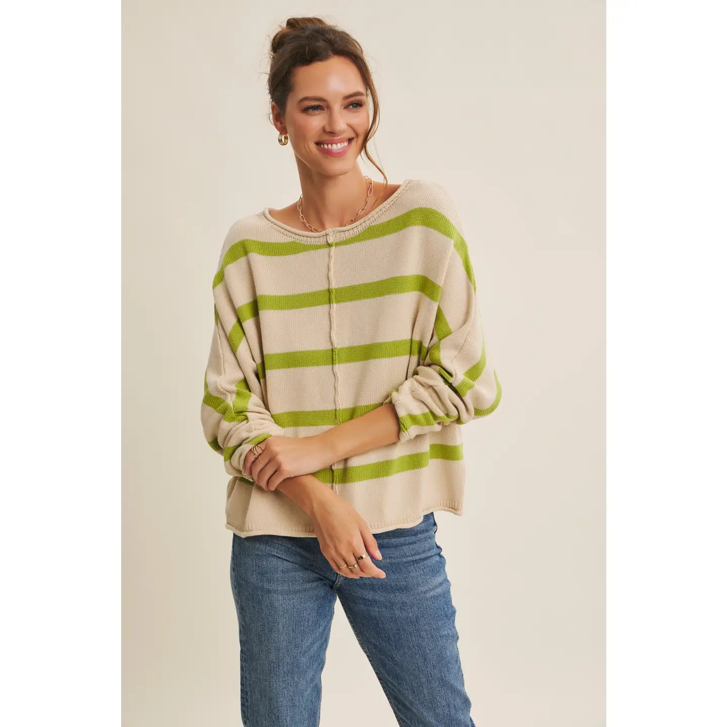 Easy, effortless, and seasonless. This striped sweater knit top is your new go-to. Designed with a relaxed oversized fit and soft 100% cotton feel, it offers both comfort and polish. The dolman sleeves and exposed seam detail bring a modern twist to the classic stripe, making it versatile for workdays, weekend errands, or a cozy day at home. Moms will love its practicality, teachers will appreciate its professional ease, and everyone can enjoy its laid-back chic vibe. Perfectly styled with denim, trousers, or skirts, this piece transitions effortlessly across outfits and occasions. A timeless stripe you’ll reach for all year long.