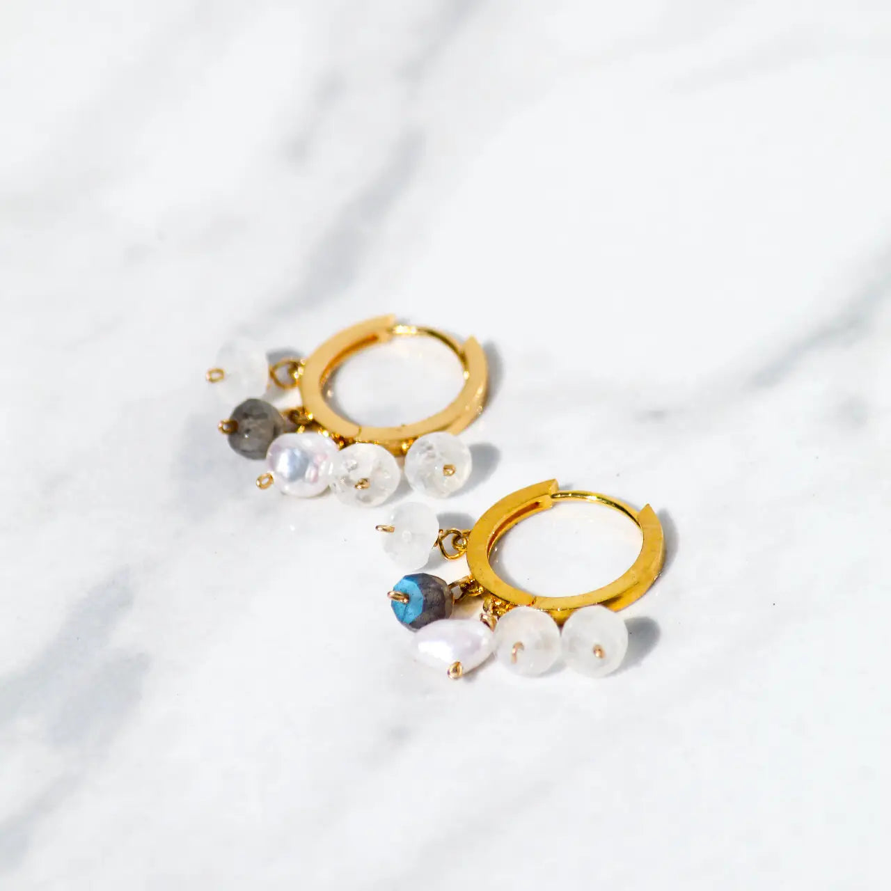 14K vermeil earrings with 5 dangling mixed gemstones- rainbow moonstone, pearl and labradorite QUALITY METALS// The pieces are designed to be worn, and cherished. By using only hypo-allergenic, lead and cadmium-free metals: 14K gold fill, vermeil and sterling silver, we are filling the gap between cheap throw away lead-based jewelry and ultra-expensive fine jewelry.