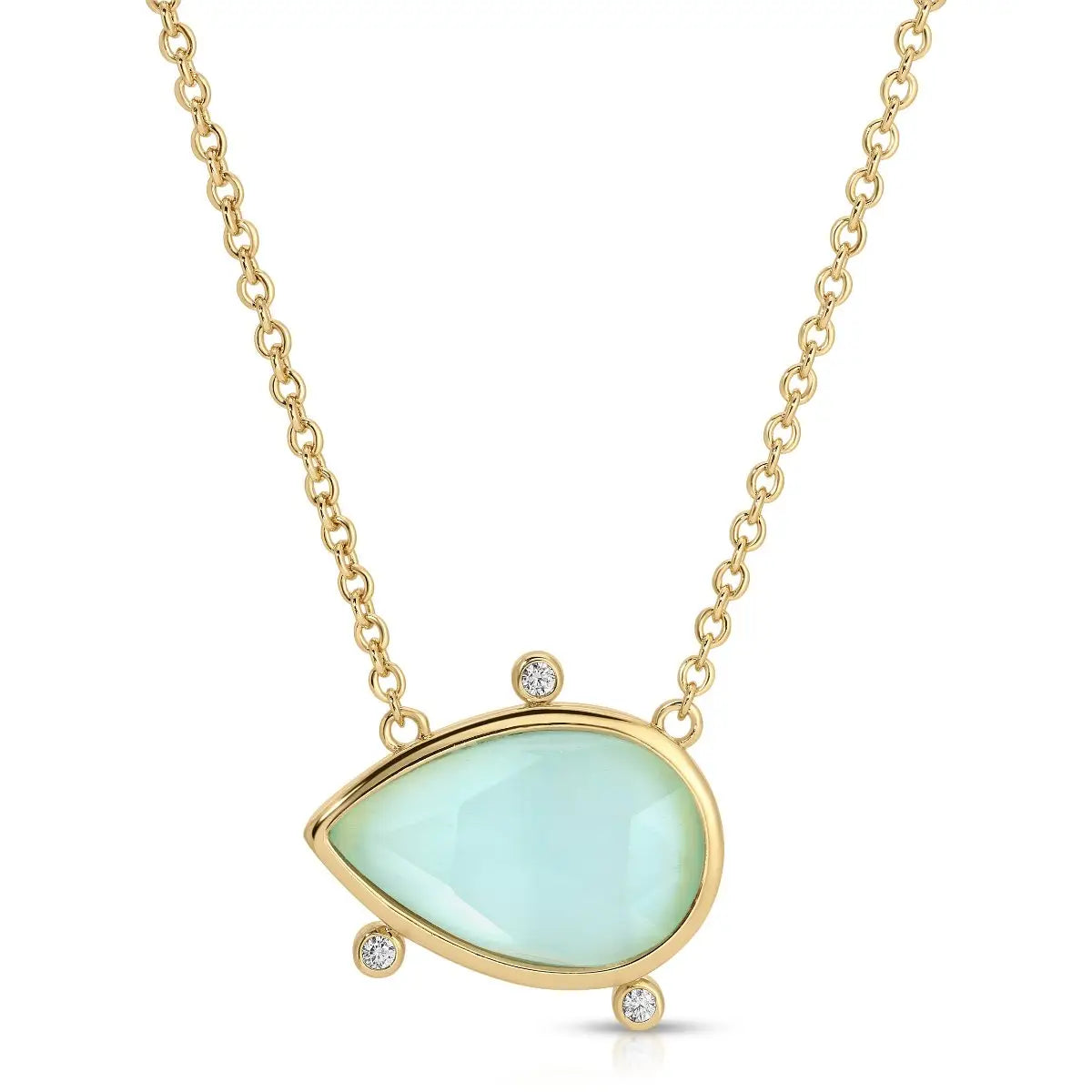 Be ready to dazzle with this unique piece featuring a sparkling tear-shaped stone and three twinkling cubic zirconia stones! * 14k gold plated brass * 17 inches+2 inch extender * mint cat's eye, cz