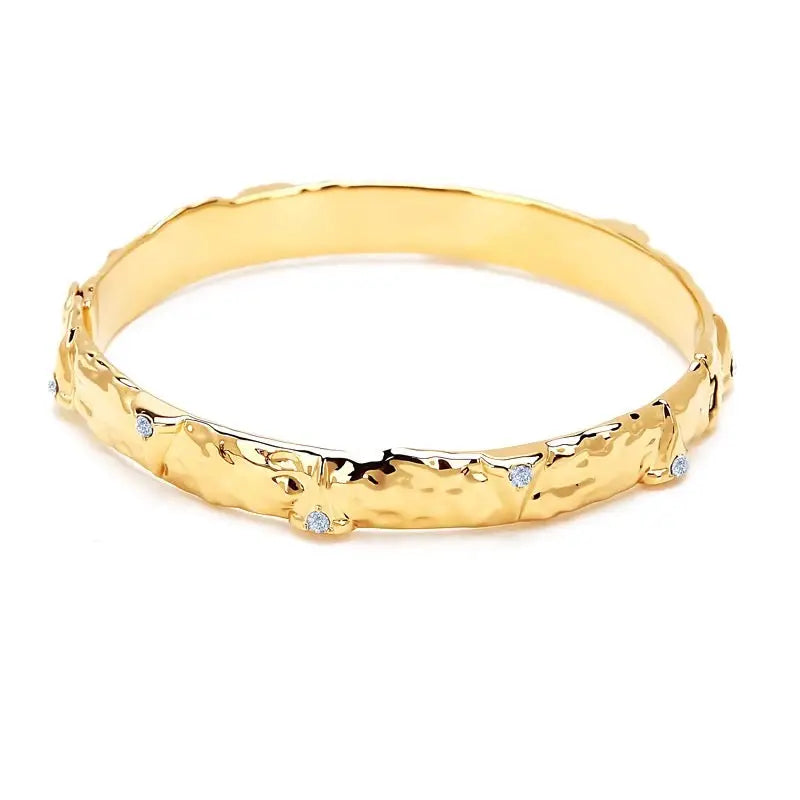 The statement bracelet you've been missing in your jewelry collection, the Carolina Bracelet, this gem features a uniquely imprinted cuff sprinkled with CZ stones. Yes, you need it. 7" diameter 18k gold plated over stainless steel CZ stones Water & tarnish resistant