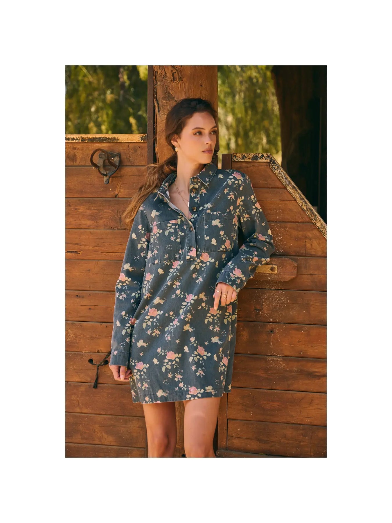 Features - Mineral-washed - Victorian floral - A-line mini dress - Half button-down - Long-sleeves - Side pockets - Collared neckline - Bust pockets Size + Fit Model is 5'9.5".